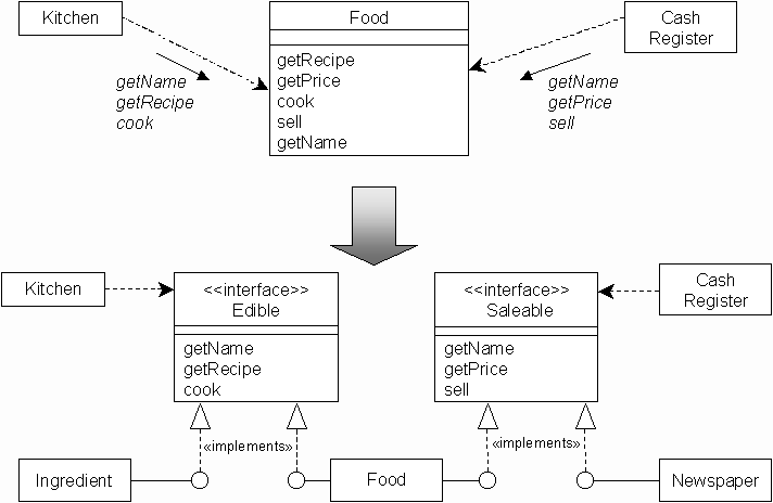 Problem: both Kitchen and Cash Register use Food class...too coupled to very different useages.Solution: