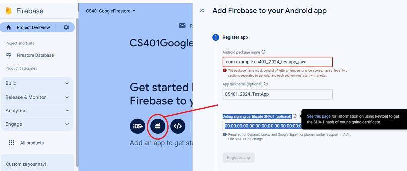 STEP 1: Click to "Add Adroid app" from Firebase Project (google firebase console) main interface