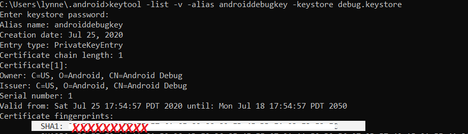 keytool -list -v -alias androiddebugkey -keystore C:\lynne\.android\debug.keystore