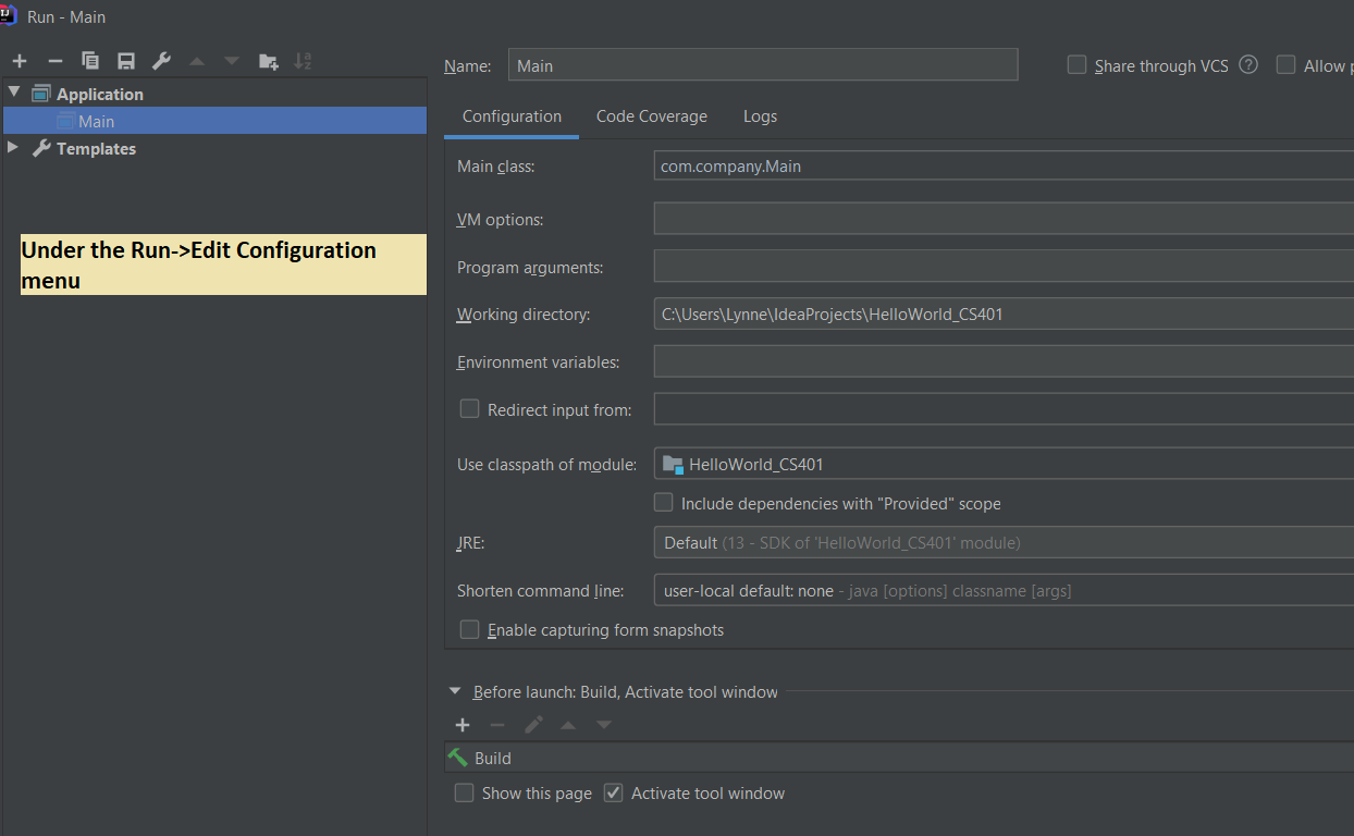 OPTION: Under Run -> Edit Configuration you can setup new or alter existing configurations. See the configuration for our application-
