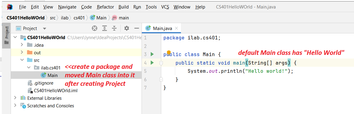 STEP 1.2:Beginning Code--IntelliJ when creating our project created for us a class called Main.java. This cass has the "special" public static void main(String[] args) method that is automatically invoked when you run the Main class code (the Java Virtual Machine will look for this and if it can't find it the program will fail to run ---this is like the main function in C++ code).