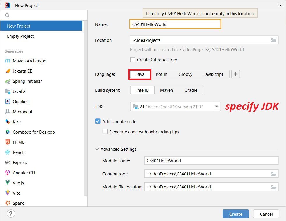 STEP 1.1: File->Create New Project, Select Java , specify IntelliJ as build system, Location, etc.