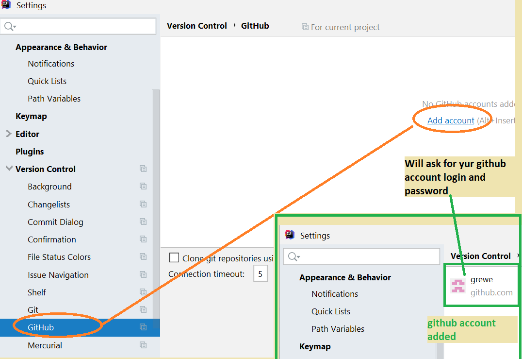 go to File->Settings, Select Version Controll and then GitHub in left side panel. Click on add account and fill in your login and password