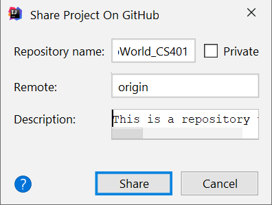 STEP2: Add a REMOTE Repository --in this case on github.com (see here on how to add your account to IntelliJ) Read this about how to automatically "share" and create a new remote repository on github. Select VCS->Import into Version Control ->Share Project on GitHub. FILL IN: