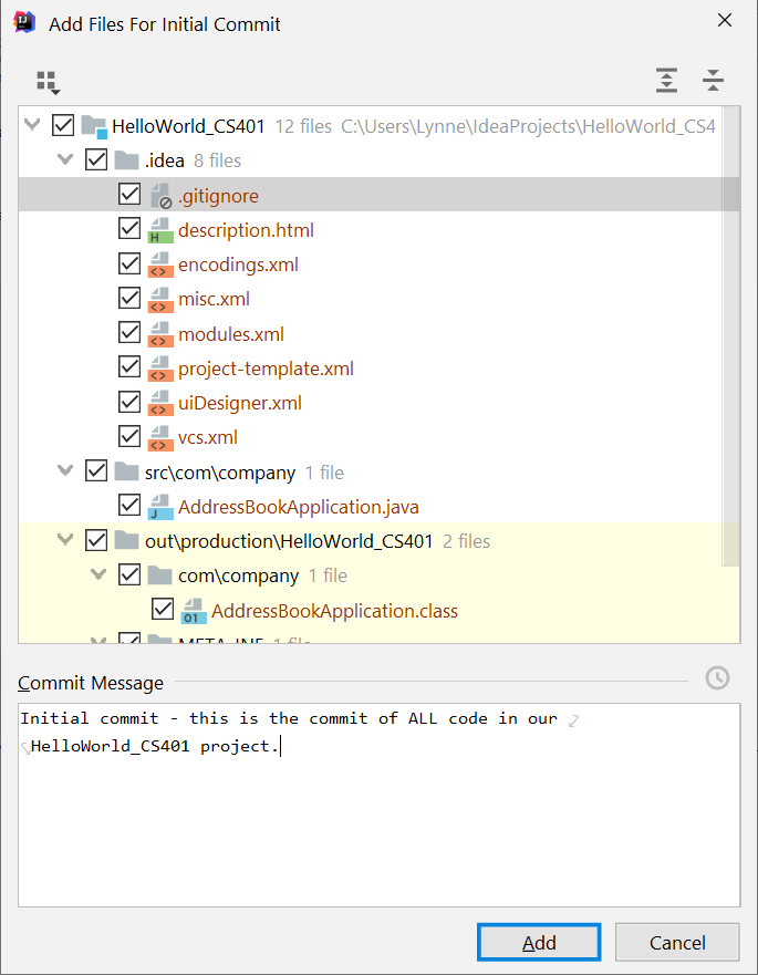 You will be asked to do an INITIAL commit --and you should add all the files (which is the default) and put in a NICE comment