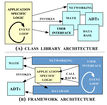 Q: What is the difference between an object-oriented framework and a class library? A: An object-oriented framework is a kind of class library. The distinguishing feature is that when the library is a framework the flow of control is bi-directional between the application and the library. This feature is achieved by the dynamic binding in object-oriented languages where an operation can be defined in a library class but implemented in a subclass in the application.