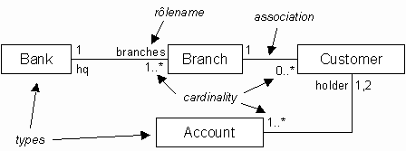 labels for the cardinality constraints or as attributes of the type furthest away from where they are written. For example, holder can be thought of as an attribute of Account, constrained to hold between 1 and 2 values of type Customer.