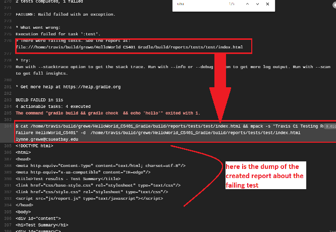 EXAMPLE 3 - extending Example 2 by adding if there is a failure to dump the created index.html page documenting the errors.Remember this is a virtual Unix machine. Any code after after_failure will be executed.So here I simply did cat filename and cat dumps the file but, if I had a server I could upload it to the server instead or?Also added the install of mpack (an email tool) in the VM so I can also email the file to myself