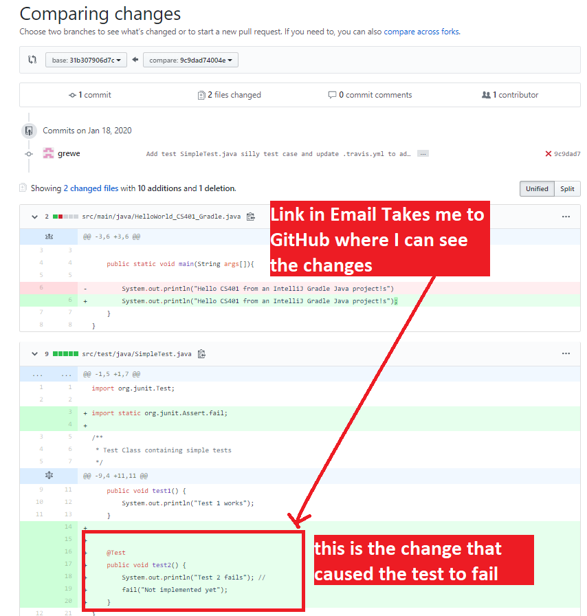 It will report (and even email you) the results --if it passed or failed. HOWEVER it does not ALWAYS tell you the detailed results of testing ---it is a kind of "STOP GAP" to not allow bad code --or rather to ALTER you bad code is entered. You can also have separate scripts you choose to run in addition to TEST cases. Email has link to take you to GitHub so you can see the changes in the code to help you figure out where it failed.