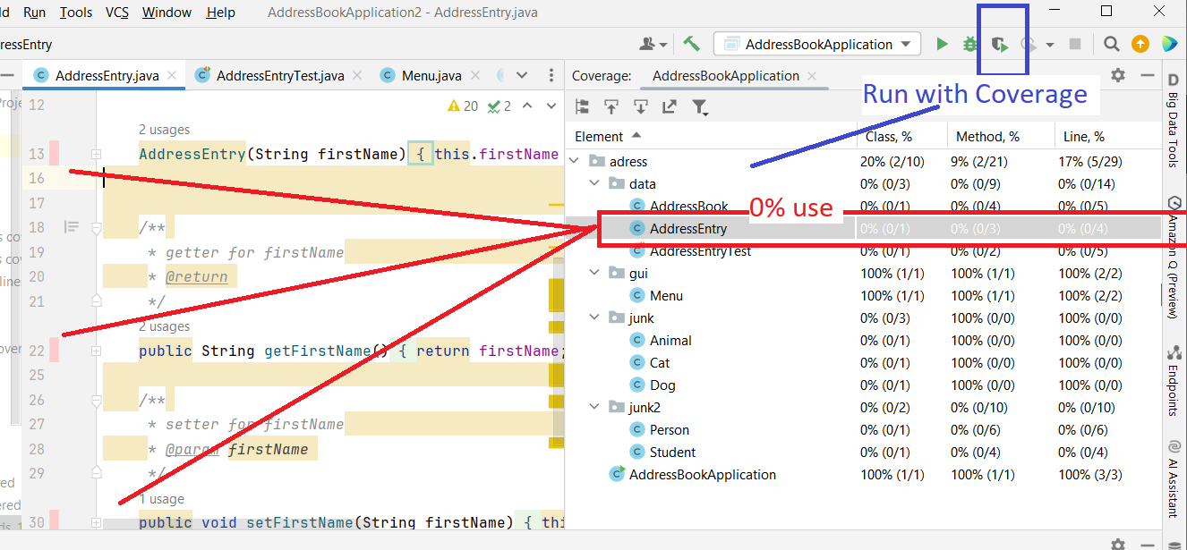 In the example below the AddressEntry class is not used. As can be seen on the right the color red next to each method indicates (through color settings) that the Cove use is low (or 0%)