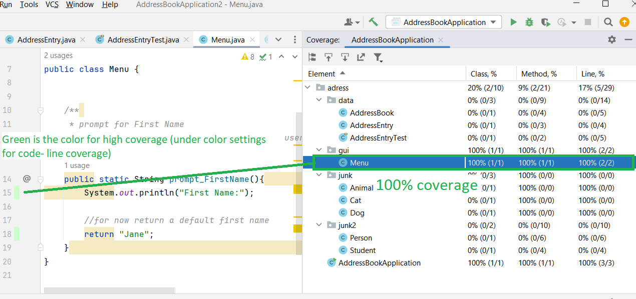 By contrasti in the IntelliJ code coverage tool Green is the color for high coverage (under color settings for code- line coverage) for the Menu class. As can be seen in the following screenshot, and the subsequent code only the Menu class is used in our main method of this very simple program.