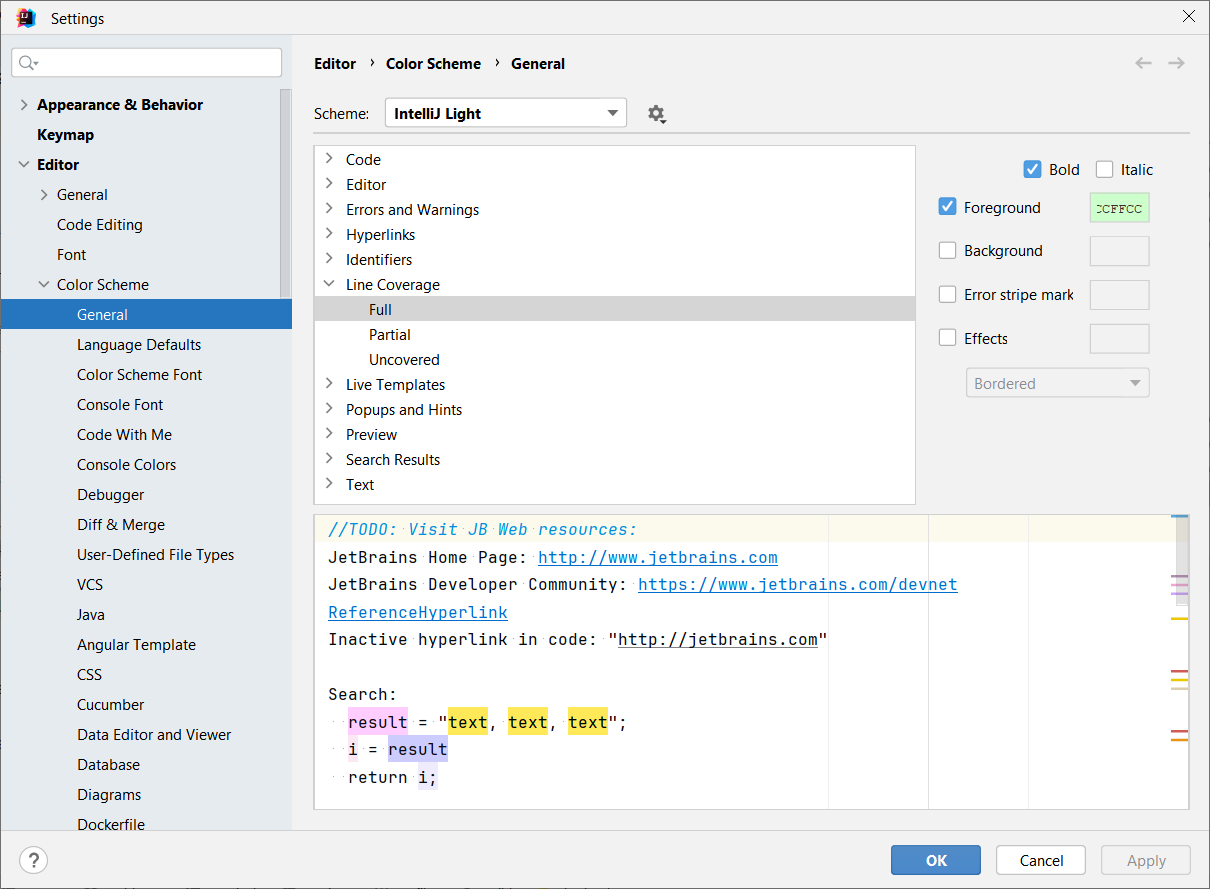Go to IntelliJ to learn how to control colors for line coverage (File->Setting, select Editor->Color Scheme , then General and under Line Coverage you can change the color for Full (100%, partial and uncovered)