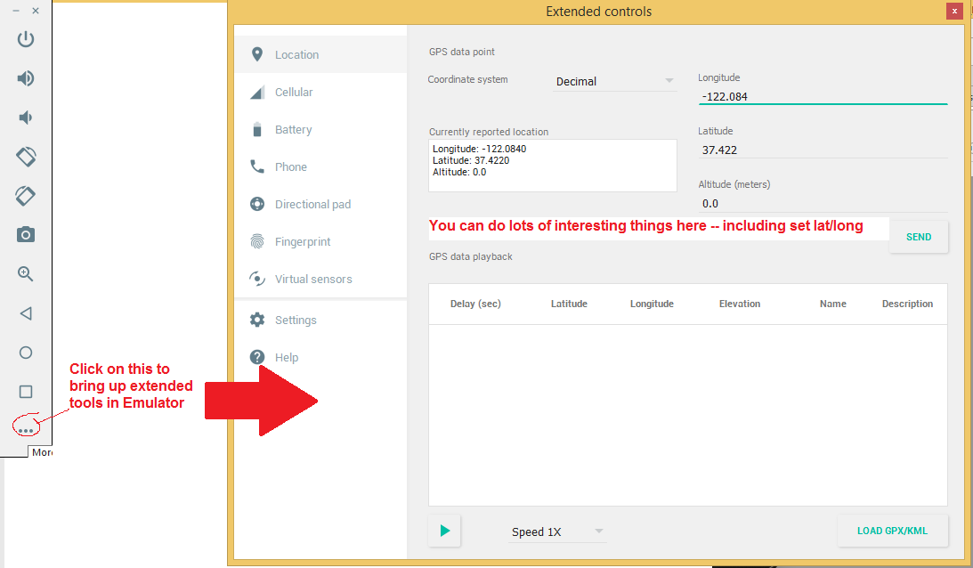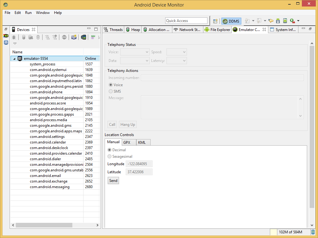 ANOTHER place for Emulator Controls (including Lat/Long)-->Android Device Monitor (Emulator Control tab)