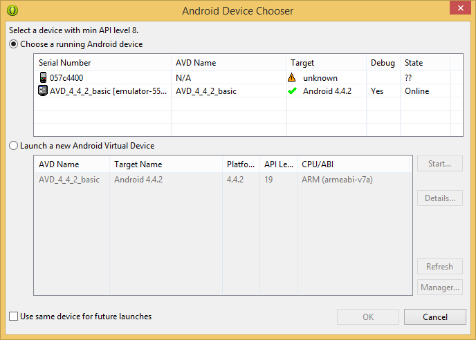 Here is an example where I have both an emulator (emulator-5554) and a device (057c4400) running