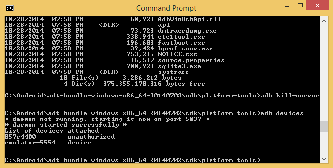 - Under the platform-tools folder, issue the adb kill-server command.