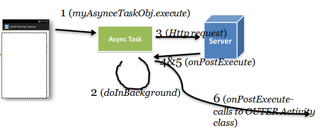 5.AsyncTask gets called back with data from #4 in onPostExecute(results)