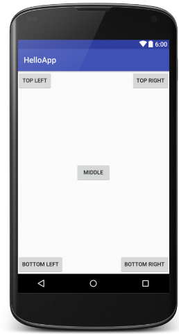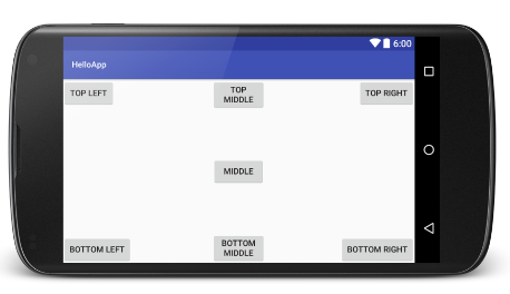 main.xml in res/layout (portrait) <?xml version="1.0" encoding="utf-8"?> <RelativeLayout xmlns:android="http://schemas.android.com/apk/res/android" android:layout_width="fill_parent" android:layout_height="fill_parent" ><Button android:id="@+id/button1" android:layout_width="wrap_content" android:layout_height="wrap_content" android:layout_alignParentLeft="true" android:layout_alignParentTop="true" android:text="Top Left" /><Button android:id="@+id/button2" android:layout_width="wrap_content" android:layout_height="wrap_content" android:layout_alignParentRight="true" android:layout_alignParentTop="true" android:text="Top Right" /><Button android:id="@+id/button3" android:layout_width="wrap_content" android:layout_height="wrap_content" android:layout_alignParentBottom="true" android:layout_alignParentLeft="true" android:text="Bottom Left" /><Button android:id="@+id/button4" android:layout_width="wrap_content" android:layout_height="wrap_content" android:layout_alignParentBottom="true" android:layout_alignParentRight="true" android:text="Bottom Right" /><Button android:id="@+id/button5" android:layout_width="wrap_content" android:layout_height="wrap_content" android:layout_centerHorizontal="true" android:layout_centerVertical="true" android:text="Middle" /></RelativeLayout> main.xml in res/layout-land (landscape)--added 2 buttons <?xml version="1.0" encoding="utf-8"?> <RelativeLayout xmlns:android="http://schemas.android.com/apk/res/android" android:layout_width="fill_parent" android:layout_height="fill_parent" ><Button android:id="@+id/button1" android:layout_width="wrap_content" android:layout_height="wrap_content" android:layout_alignParentLeft="true" android:layout_alignParentTop="true" android:text="Top Left" /><Button android:id="@+id/button2" android:layout_width="wrap_content" android:layout_height="wrap_content" android:layout_alignParentRight="true" android:layout_alignParentTop="true" android:text="Top Right" /><Button android:id="@+id/button3" android:layout_width="wrap_content" android:layout_height="wrap_content" android:layout_alignParentBottom="true" android:layout_alignParentLeft="true" android:text="Bottom Left" /><Button android:id="@+id/button4" android:layout_width="wrap_content" android:layout_height="wrap_content" android:layout_alignParentBottom="true" android:layout_alignParentRight="true" android:text="Bottom Right" /><Button android:id="@+id/button5" android:layout_width="wrap_content" android:layout_height="wrap_content" android:layout_centerHorizontal="true" android:layout_centerVertical="true" android:text="Middle" /><Button android:id="@+id/button6" android:layout_width="180px" android:layout_height="wrap_content" android:layout_centerVertical="true" android:layout_alignParentTop="true" android:text="Top Middle" /><Button android:id="@+id/button7" android:layout_width="180px" android:layout_height="wrap_content" android:layout_centerVertical="true" android:layout_alignParentBottom="true" android:text="Bottom Middle" /></RelativeLayout>