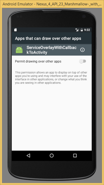//brings up interface to settings for user to allow overlay public static void requestSystemAlertPermission(Activity context, int requestCode) { if (Build.VERSION.SDK_INT < Build.VERSION_CODES.M) return; final String packageName = context == null ? context.getPackageName() : context.getPackageName(); final Intent intent = new Intent(Settings.ACTION_MANAGE_OVERLAY_PERMISSION, Uri.parse("package:" + packageName)); if (context != null) context.startActivityForResult(intent, requestCode); else context.startActivityForResult(intent, requestCode); } @TargetApi(23) public static boolean isSystemAlertPermissionGranted(Context context) { final boolean result = Build.VERSION.SDK_INT < Build.VERSION_CODES.M || Settings.canDrawOverlays(context); return result; }
