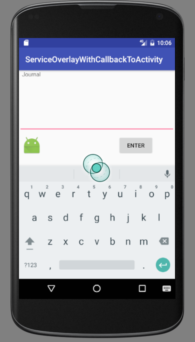 After hitting back button we see the app with the Service launched that creates the "Overlay"