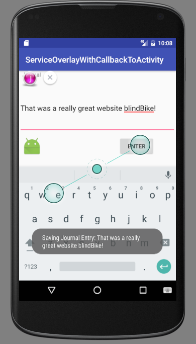 Lets entery in some text and hit Enter --this will cause 2 things to happen 1) the text is read and filled into a Toast message and 2) it restarts the service