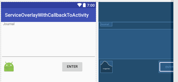 <?xml version="1.0" encoding="utf-8"?> <android.support.constraint.ConstraintLayout xmlns:android="http://schemas.android.com/apk/res/android" xmlns:app="http://schemas.android.com/apk/res-auto" xmlns:tools="http://schemas.android.com/tools" android:layout_width="match_parent" android:layout_height="match_parent" tools:context="computervision.grewe.serviceoverlayexample.MainActivity">