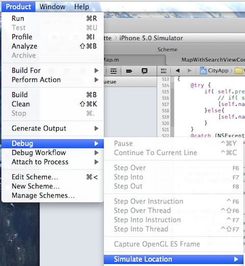 3. Choose a Location from the Debug Bar. if you are not running iOS 5.0 or later, these options can’t be used. Switch to iPhone 5.0 Simulator to allow selection: