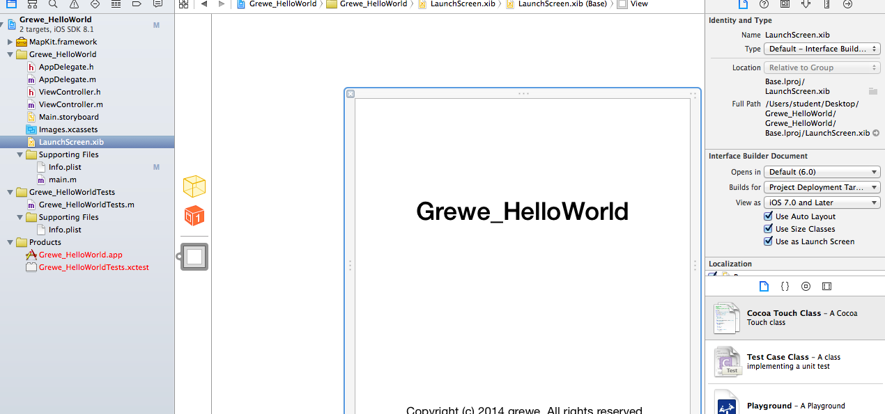 - Launch Interface Builder by double clicking on the the interface file called LaunchScreen.xib (this is the default name of the single view app's first interface) if you created a Single View type applciation. This represents the single current interface for this application