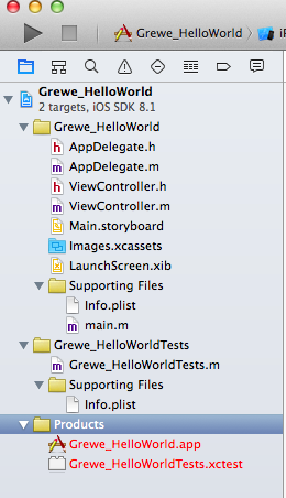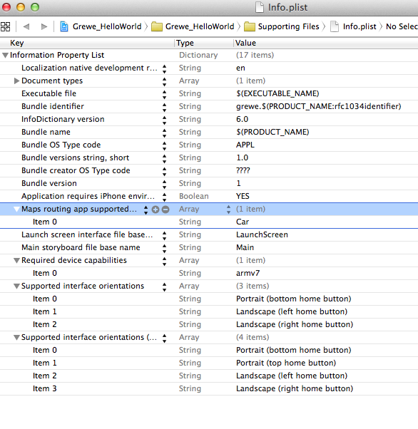 - PropertyList Info.plist = contains name vlaue pairings giving icons, whether app needs persistent Wi-Fi connection, default language of applciation and much more. Lists if you want different images for different devices (icon.png = default, icon~ipad.png = for ipad, icon~iphone.png = for iphone). Note can bring up this list by