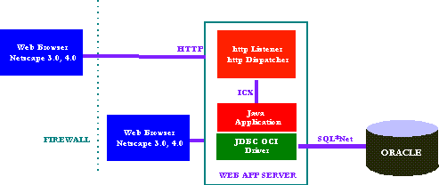 The above is a traditional 2-tier client-server architectures. The first uses Oracle and JDBC OCI driver (hence only for a Java Applicatio). The second diagram shows a 2-tier client-server architecture for Java Applet using the Thin JDBC driver.