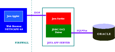 The above is a 3-tier client-server-server architecture using Oracle and JDBC OCI driver. Here there is a middle Java w/JDBC application that sits on the server and client application or applet communicates with it via HTTP calls (or you could use sockets).