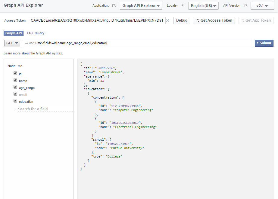 Here I am asking for information about me with the fields of id, name, age_range, education