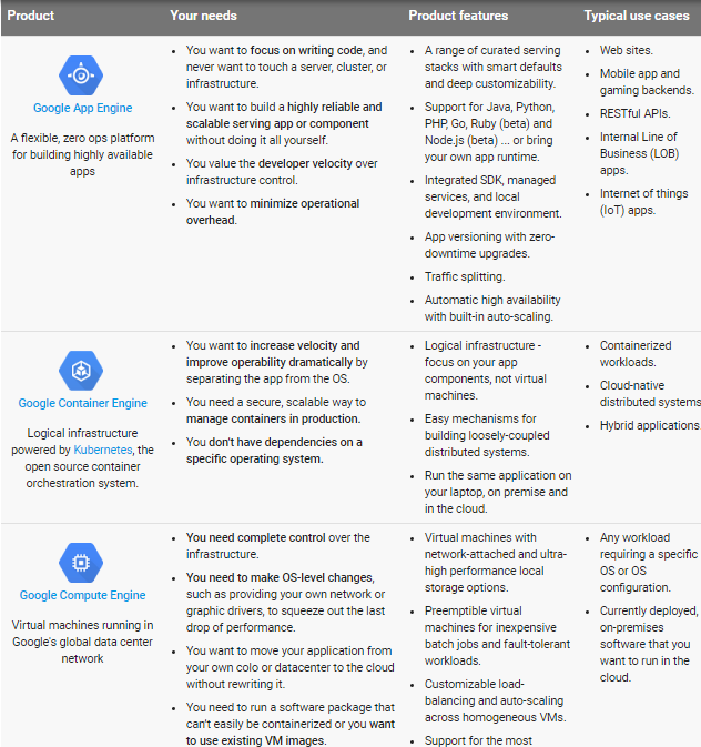 App Engine Standard: limited runtimes (Python, Java, PHP, Go), very simple to get up and running, auto-scaled etc. Focused APIs designed specifically for App Engine.