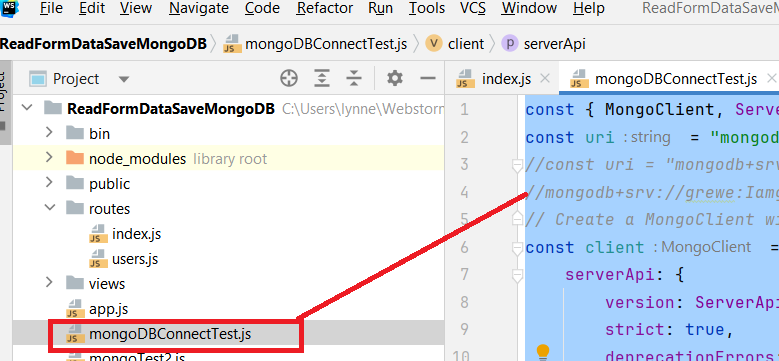 STEP 3) In your NodeJS+Express project add at the top level of the project a file called mongoDBConnectTest.js the following code