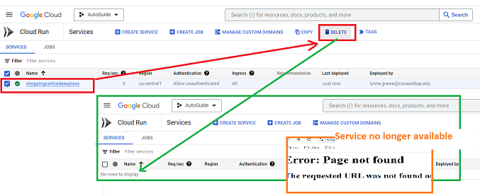 - After deletion, the service remains visible in the Google Cloud console and in the command line interface until the deletion is fully complete. However, you cannot update the service.