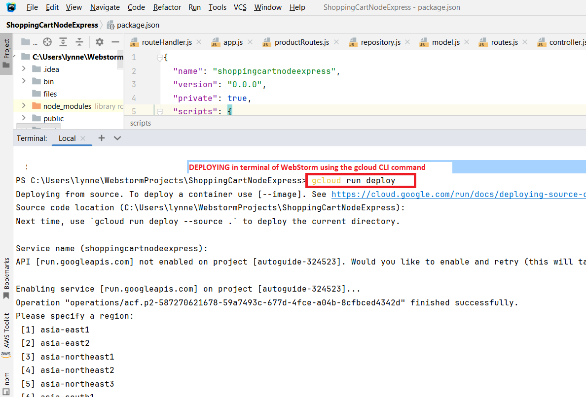 To Deploy In the Terminal window of your Webstorm project type in the command line command to deploy gcloud run deploy