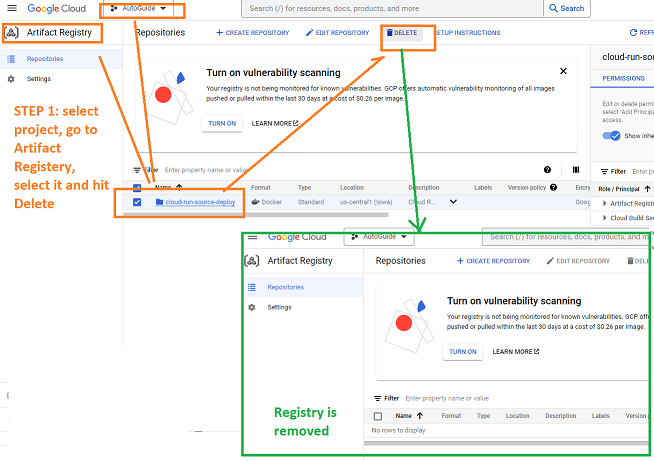 select project, go to Artifact Registery, select it and hit Delete
