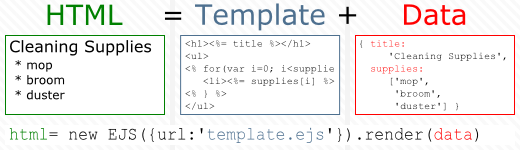 // load the template file, then render it with data var html = new EJS({url: 'cleaning.ejs'}).render(data); //now you can take the html and associate it with some div tag to display div_tag.innerHTML = html;Organizing ejs - pages and partials