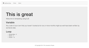<!-- views/partials/header.ejs --> <nav class="navbar navbar-default" role="navigation"> <div class="container-fluid"> <div class="navbar-header"> <a class="navbar-brand" href="#"> <span class="glyphicon glyphicon glyphicon-tree-deciduous"></span>EJS Is Fun</a> </div> <ul class="nav navbar-nav"> <li><a href="/">Home</a></li> <li><a href="/about">About</a></li> </ul> </div> </nav>footer.ejs (again no javascript inside --but could have)
