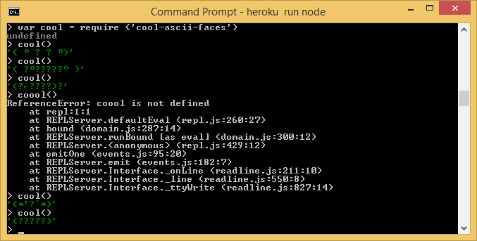 look what happens when I use the cool-ascii-faces module and run the funciton cool() a few times --- look what happens when I try to run coool() which does not exist.