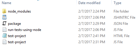 - Copy the test-project.html, test-project.js, package.json, runt-tests-using-node.js and .jshintrc files into diretory so it looks like the following