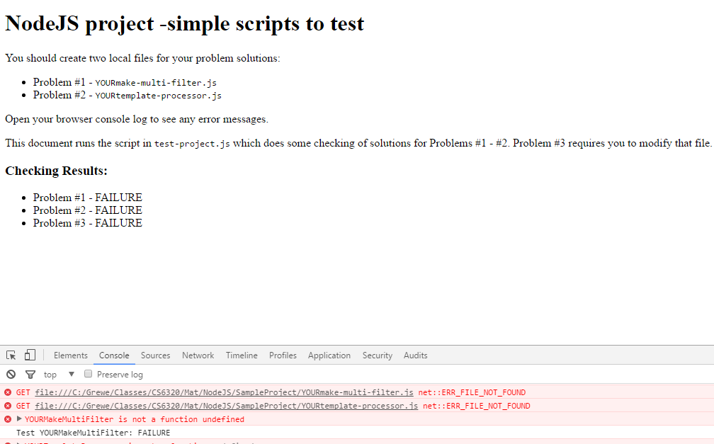 Step 5: RUNNING IT: 2 alternatives: 1) Run by loading the test-project.html in the browser and bring up console under developer tools 2) run the run-test-using-node.js file