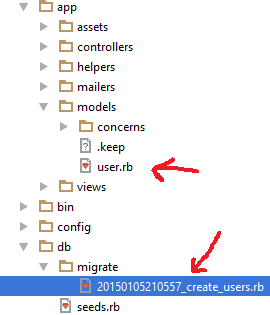 This will create a migration file with a name something like 20120330202846_create_users.rb in the directory db/migrate. It will also create an initial model file app/models/user.rb.