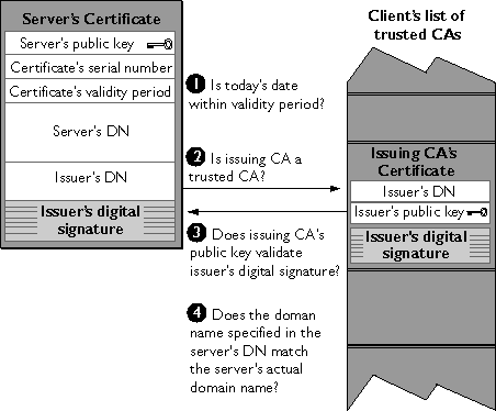 3.Does the issuing CA's public key validate the issuer's digital signature? The client uses the public key from the CA's certificate (which it found in its list of trusted CAs in step 2) to validate the CA's digital signature on the server certificate being presented. If the information in the server certificate has changed since it was signed by the CA or if the CA certificate's public key doesn't correspond to the private key used by the CA to sign the server certificate, the client won't authenticate the server's identity. If the CA's digital signature can be validated, the server treats the user's certificate as a valid "letter of introduction" from that CA and proceeds. At this point, the client has determined that the server certificate is valid. It is the client's responsibility to take Step 4 before Step 5.