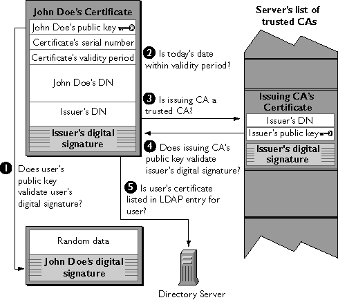 1.Does the user's public key validate the user's digital signature? The server checks that the user's digital signature can be validated with the public key in the certificate. If so, the server has established that the public key asserted to belong to John Doe matches the private key used to create the signature and that the data has not been tampered with since it was signed. At this point, however, the binding between the public key and the DN specified in the certificate has not yet been established. The certificate might have been created by someone attempting to impersonate the user. To validate the binding between the public key and the DN, the server must also complete Step 3 and Step 4.