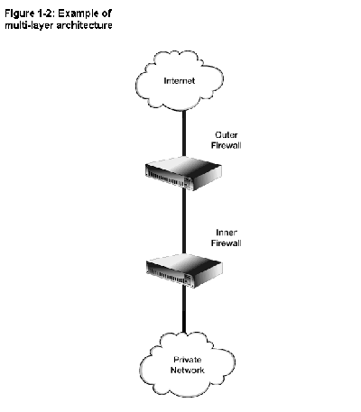 • note: possibly using different technology in each of these firewall hosts. This reduces the risk that the same implementation flaws or configuration errors will exist in every layer.