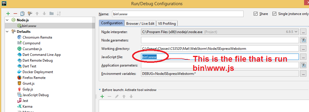 • run configuration settings will determine what javascript file is run when you run the app --here it is pointing to the bin\www.js file