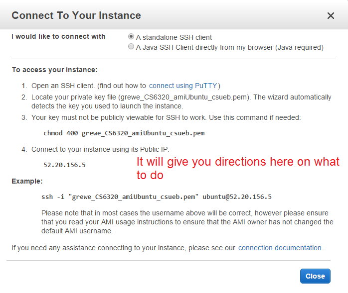 Step 1) log onto aws.amazon.com, on dashboard hit EC2 then, Instances....right click on the instance you want to connect to and select Connect