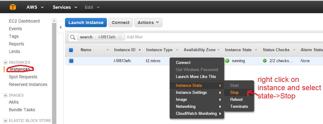 How to STOP a launched running EC2 instance