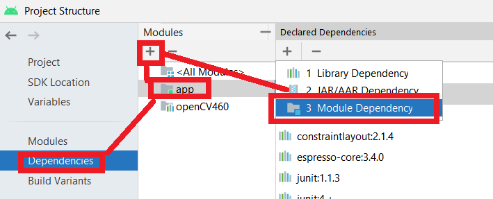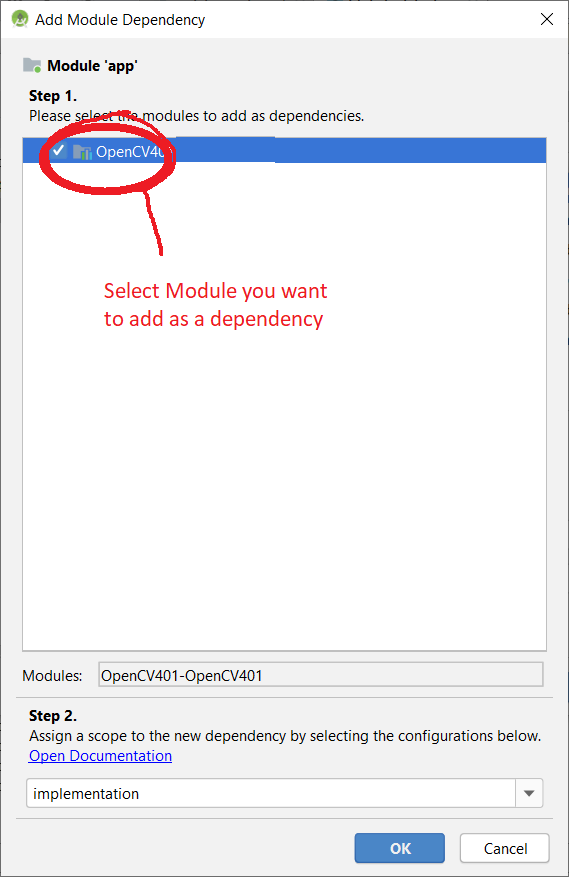 STEP 3) Now add the OpenCV module as a dependency to your projects "app"