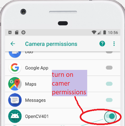 to use the camera ---Settings->App Permissions ->Camera->Name of YOUR app and turn it on
